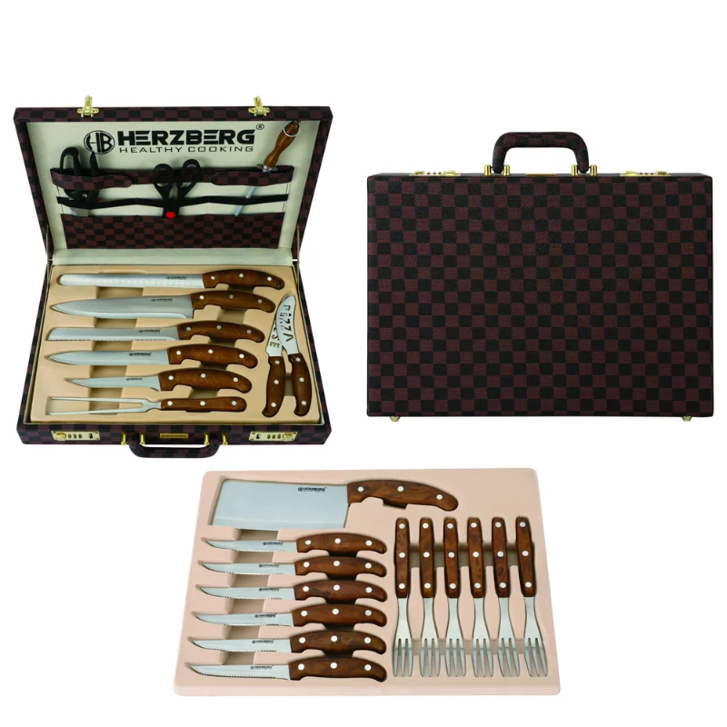Experimentați arta măiestriei culinare cu setul de cuțit și tacâmuri Herzberg HG-K25LB din 25 de piese cu carcasă atașată – o dovadă a tradiției, preciziei și eleganței în fiecare felie.