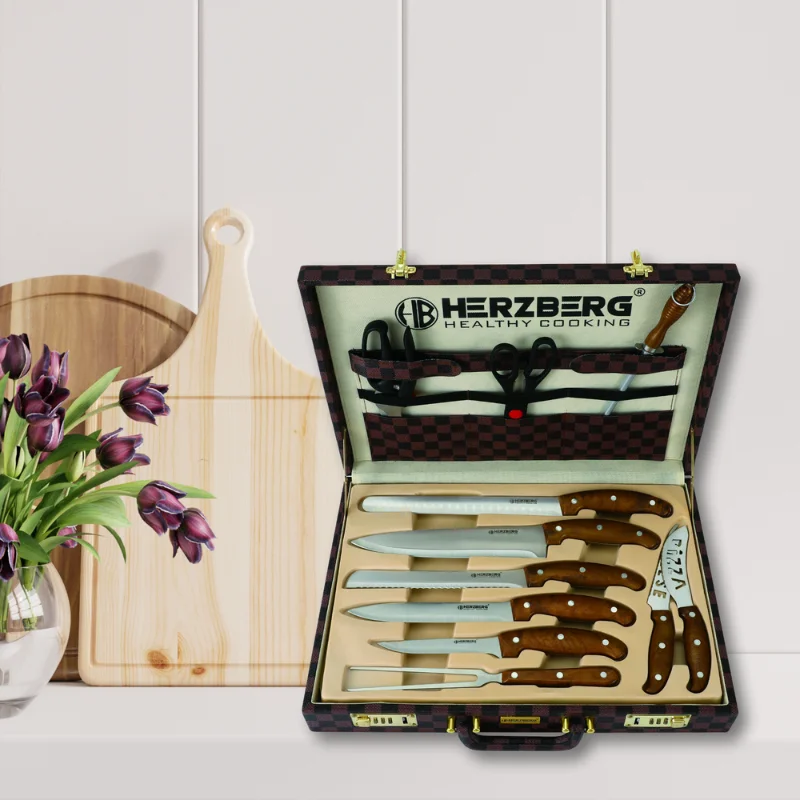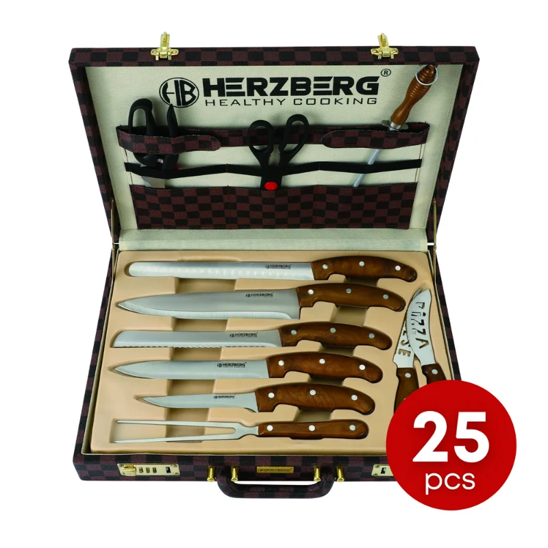 Adăugând la atractivitatea sa, Herzberg HG-K25LB combină funcționalitatea cu estetica. Mânerele, realizate din nuc masiv, oferă nu numai o prindere confortabilă, ci și o notă de eleganță atemporală. Întregul ansamblu este bine organizat într-o cutie atașată de lux, asigurând că uneltele tale culinare nu sunt doar protejate, ci și prezentate rafinat.