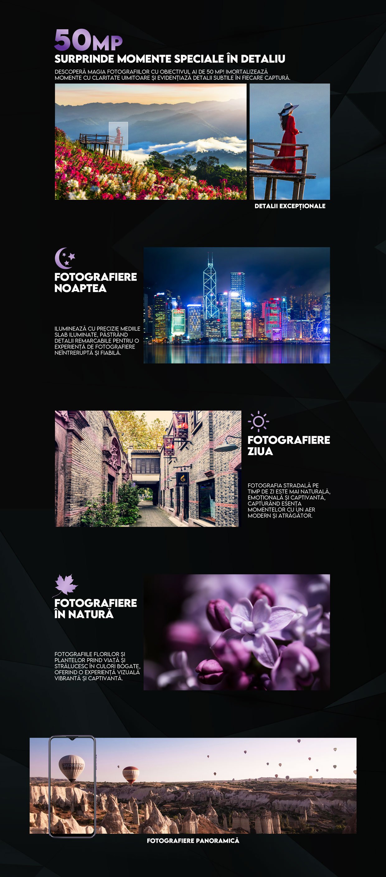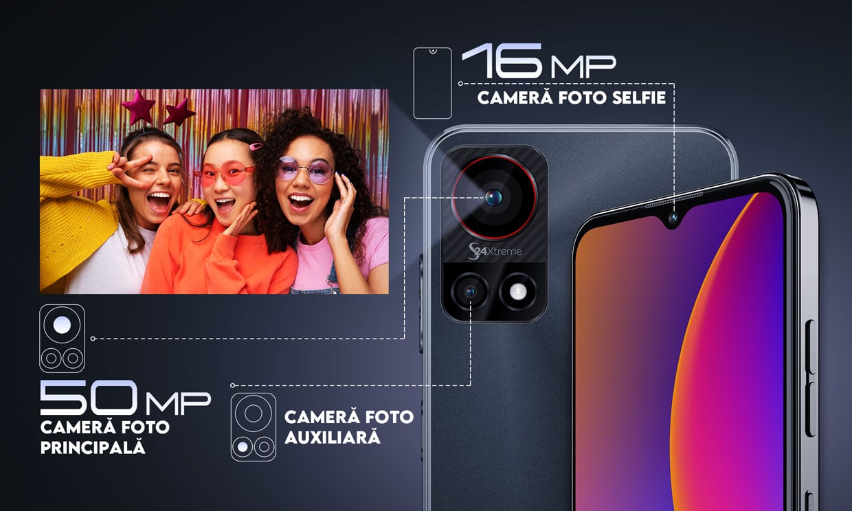 Telefonul este echipat cu o cameră foto principală de 50 megapixeli, perfectă pentru peisaje, portrete și fotografii de zi cu zi. Camera frontală de 16MP asigură selfie-uri clare și apeluri video de calitate.