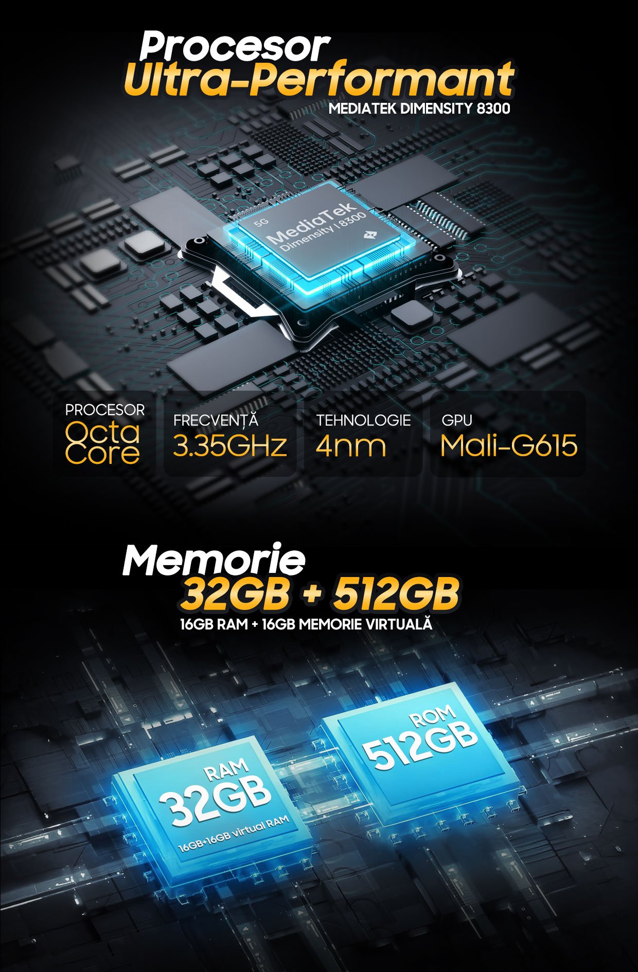Echipat cu procesorul Dimensity 8300 (8 nuclee, până la 3.35GHz) și cu 32GB RAM (16GB RAM + 16GB Memorie Virtuala), Tank 4 Pro îți garantează performanță fluidă și rapiditate indiferent de aplicații, gaming sau multitasking.